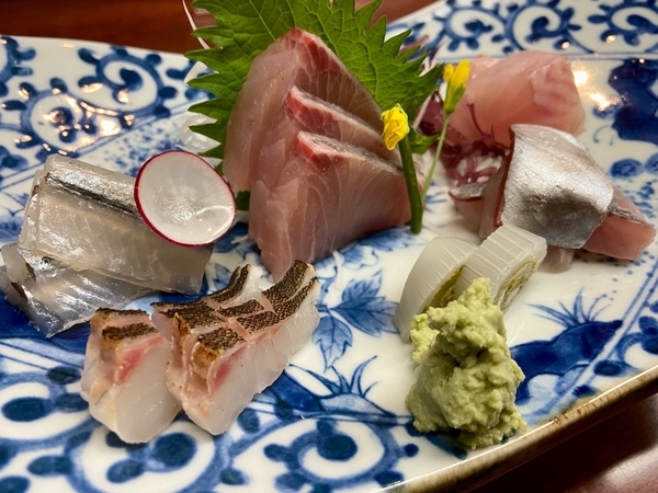 サヨリ、ブリヒラ、ヤナギバチメ、タカバ炙り、アカイカ、マアジ、の6種盛りです。