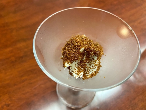 最後の品は、「ふぐ卵巣とマスカルポーネの出会い」と言う料理です。